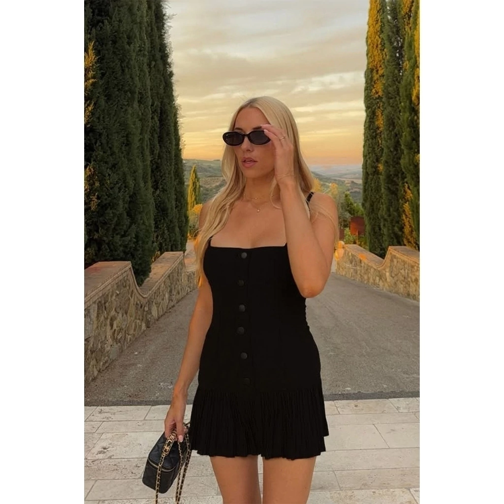 Este vestido curto com alça fina é a combinação perfeita entre delicadeza e sofisticação. Possui modelagem ajustada ao corpo que valoriza a silhueta, botões decorativos frontais e um charmoso babado plissado na barra, trazendo movimento e leveza ao look. Ideal para festas, jantares ou eventos casuais com estilo. Confeccionado em tecido confortável e com excelente caimento, é uma peça indispensável no guarda-roupa feminino.